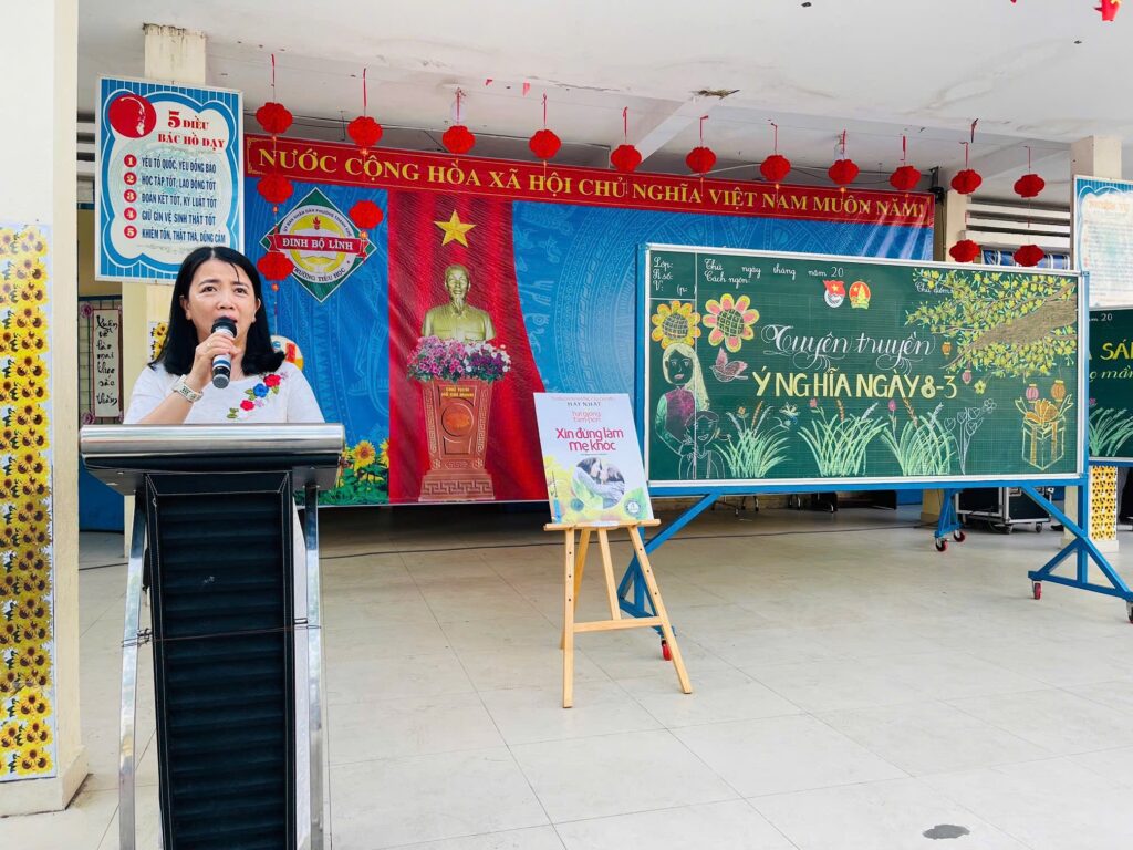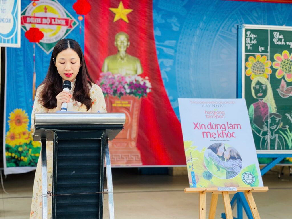 Khép lại buổi chào cờ, cô giáo Đinh Thị Bảo Thu – Nhân viên thư viện trường đã giới thiệu đến các em học sinh cuốn sách “Xin đừng làm mẹ khóc”. Cuốn sách là những câu chuyện giản dị nhưng đầy xúc động về tình mẫu tử thiêng liêng, nhắc nhở mỗi chúng ta hãy biết trân trọng, yêu thương và quan tâm đến mẹ khi còn có thể. Phần giới thiệu sách đã để lại nhiều cảm xúc trong lòng các em học sinh.