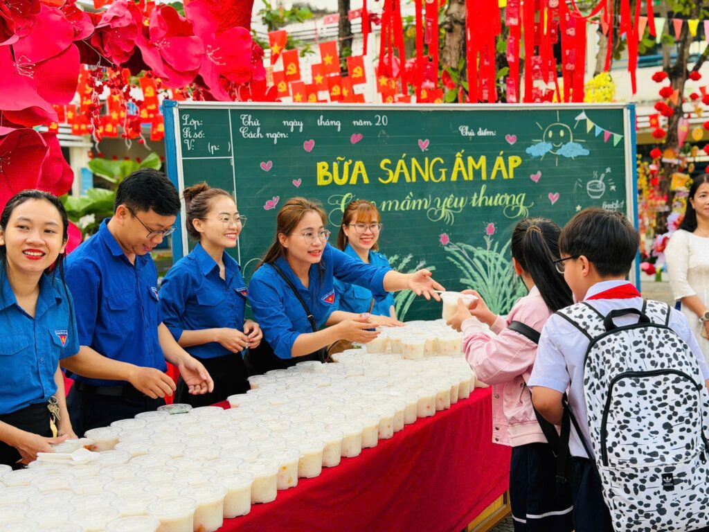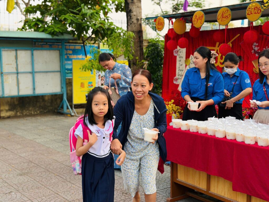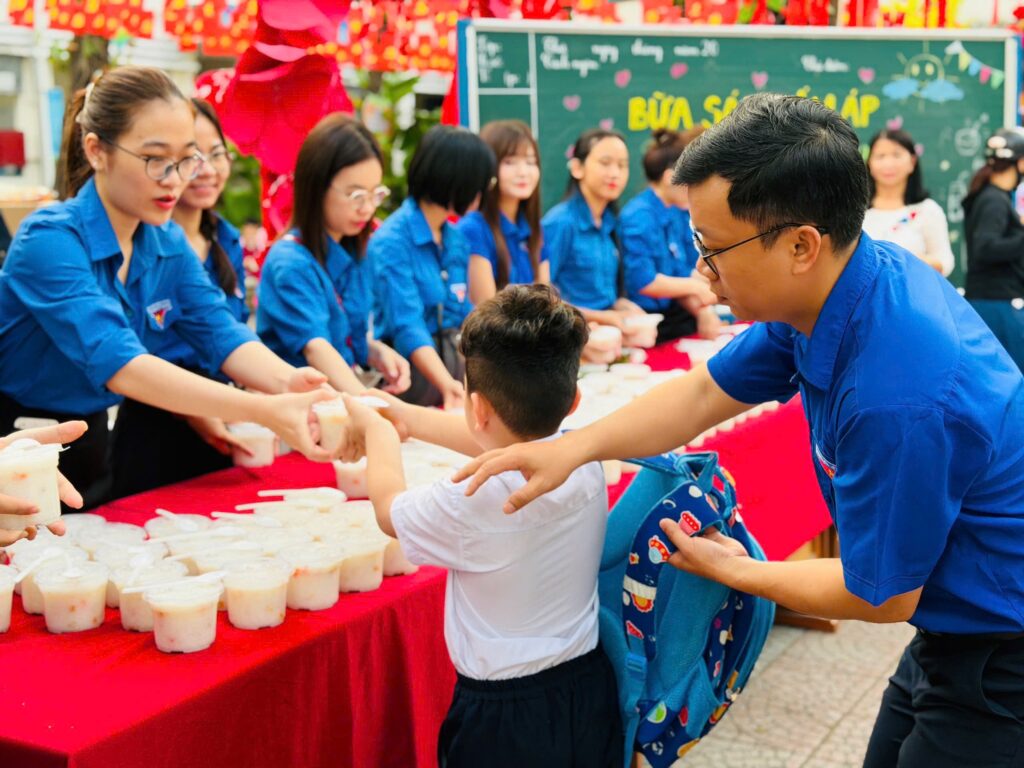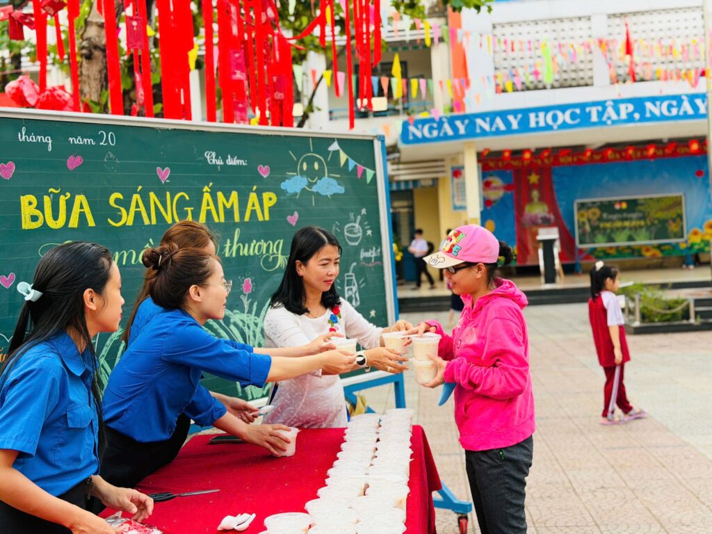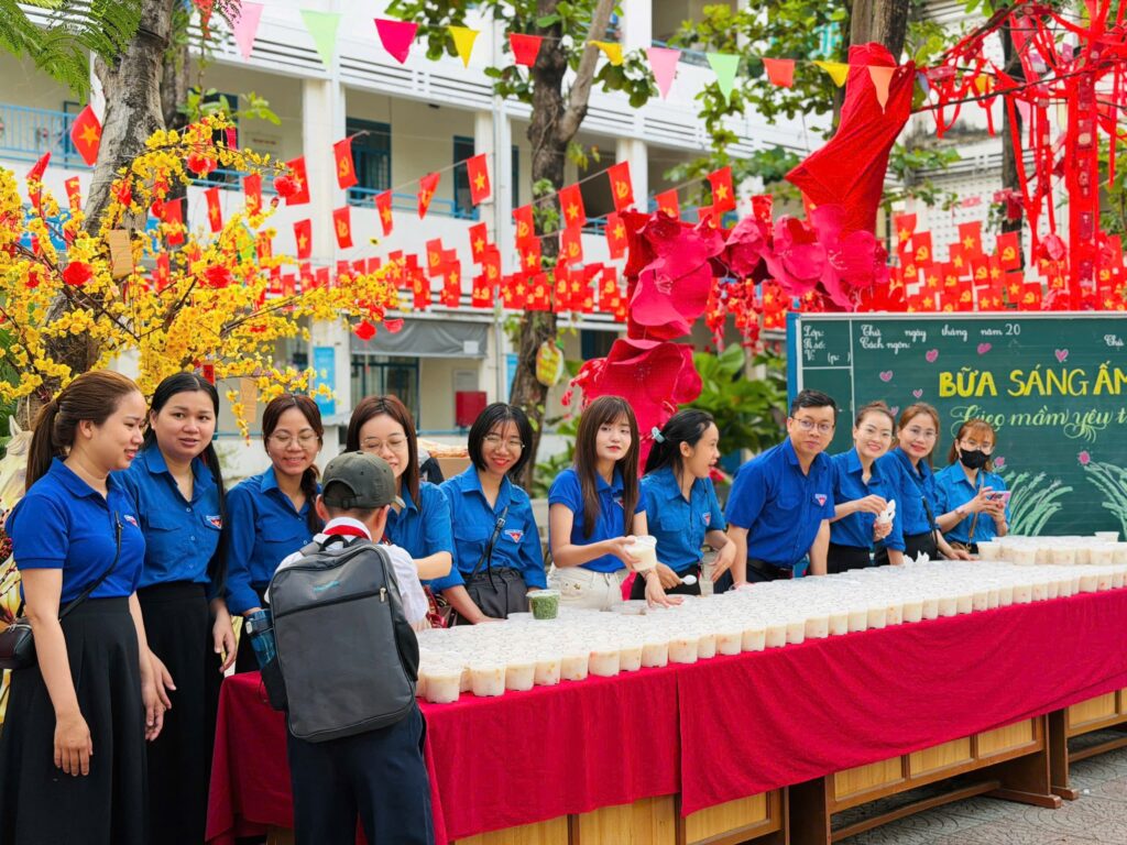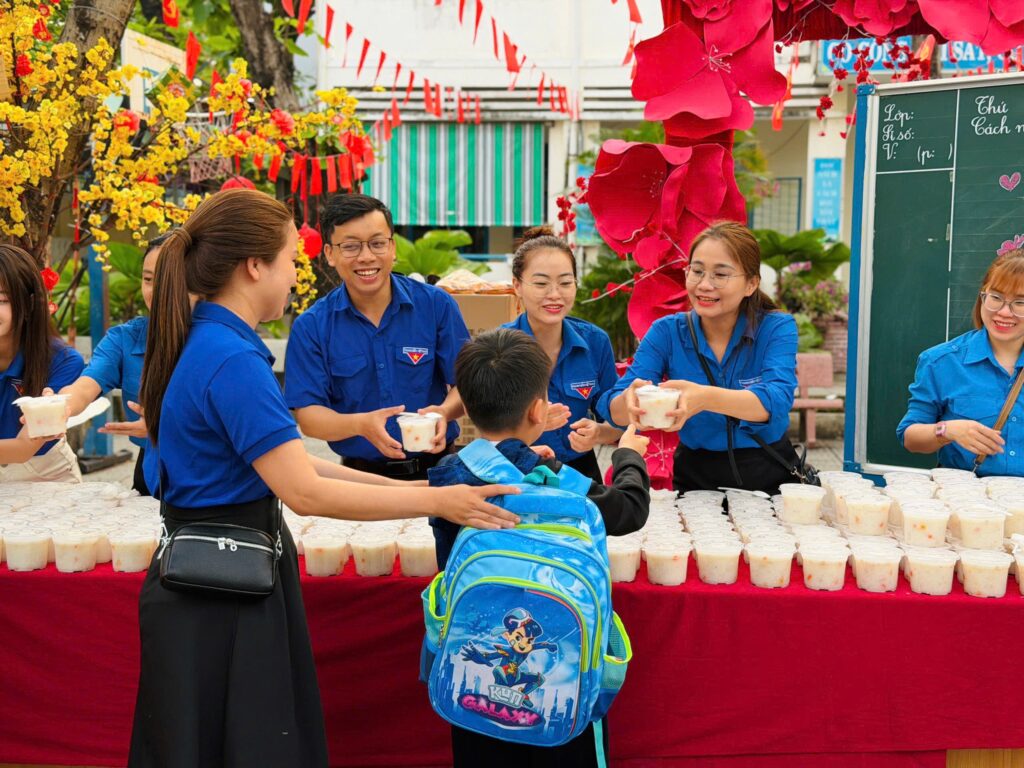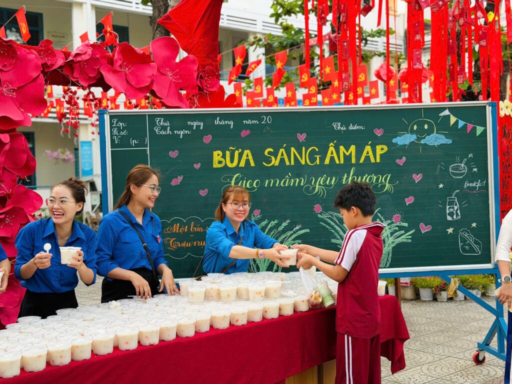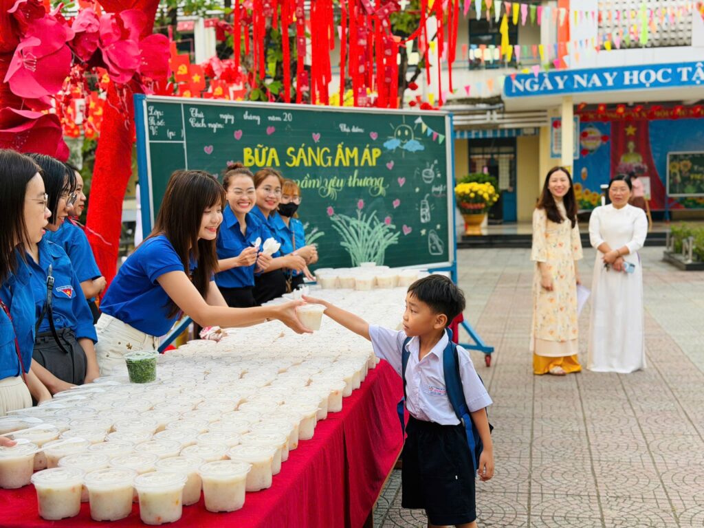 🌅 Sáng nay 2/3/2026 – nhằm ngày 14 tháng Giêng, sân trường Tiểu học Đinh Bộ Lĩnh rộn ràng hơn thường lệ. Từ rất sớm, các cô trong tà áo dài duyên dáng, các thầy cô trong Chi đoàn nhà trường đã tất bật chuẩn bị từng phần quà, từng tô cháo nóng hổi được xếp ngay ngắn trên những dãy bàn phủ khăn đỏ thắm.