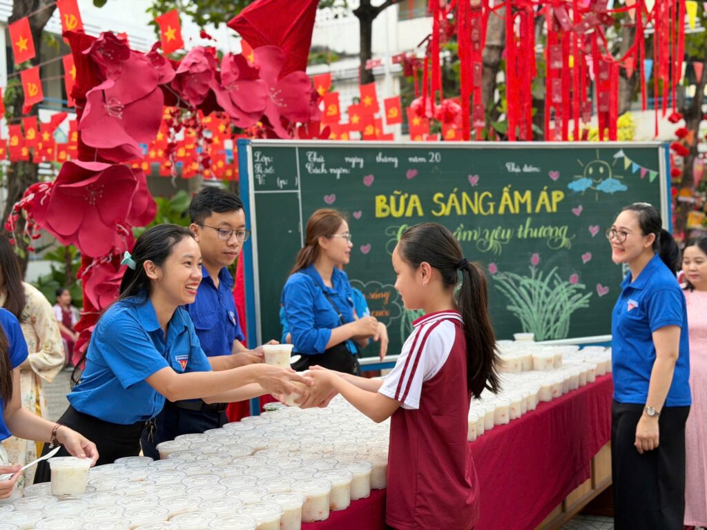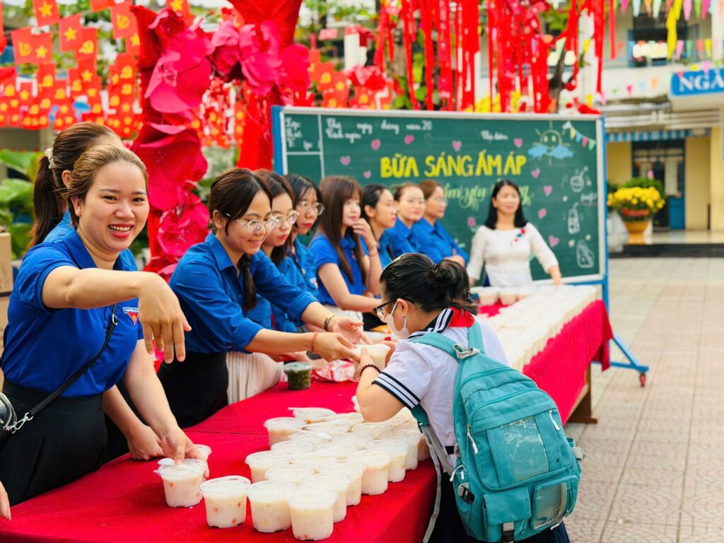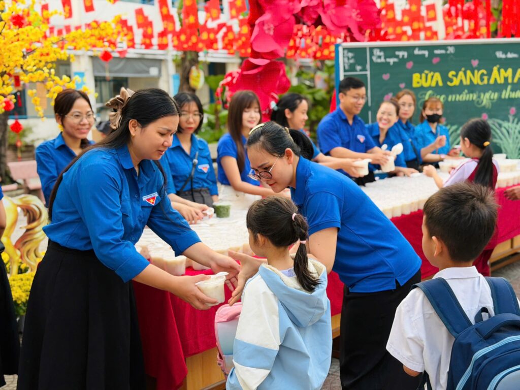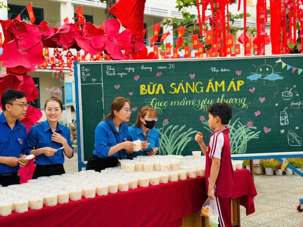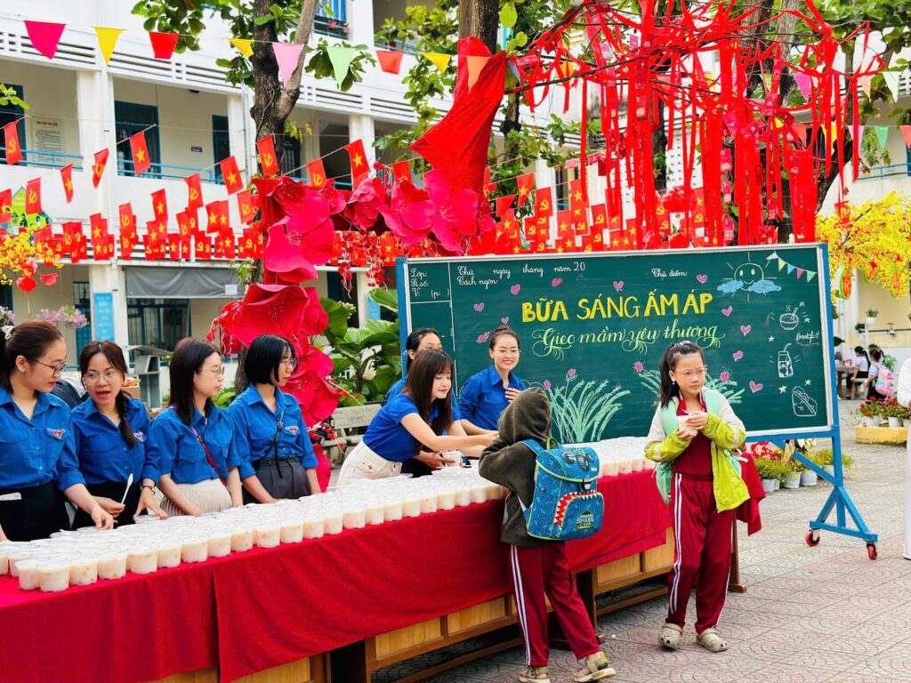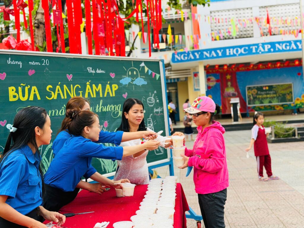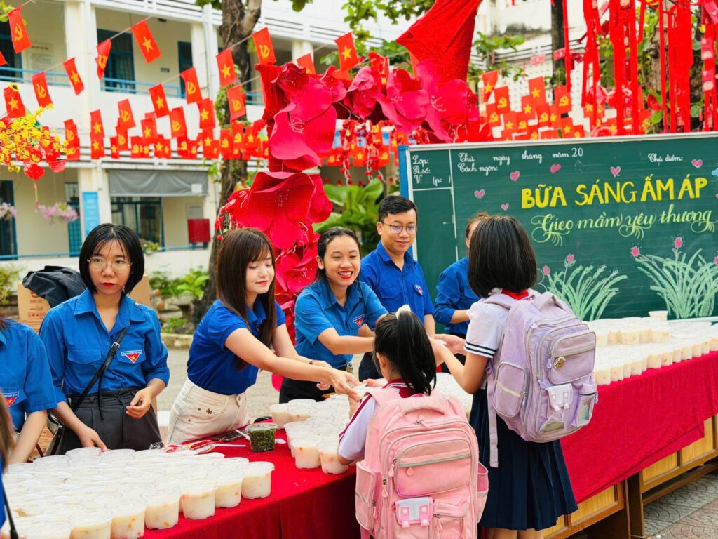🌅 Sáng nay 2/3/2026 – nhằm ngày 14 tháng Giêng, sân trường Tiểu học Đinh Bộ Lĩnh rộn ràng hơn thường lệ. Từ rất sớm, các cô trong tà áo dài duyên dáng, các thầy cô trong Chi đoàn nhà trường đã tất bật chuẩn bị từng phần quà, từng tô cháo nóng hổi được xếp ngay ngắn trên những dãy bàn phủ khăn đỏ thắm.