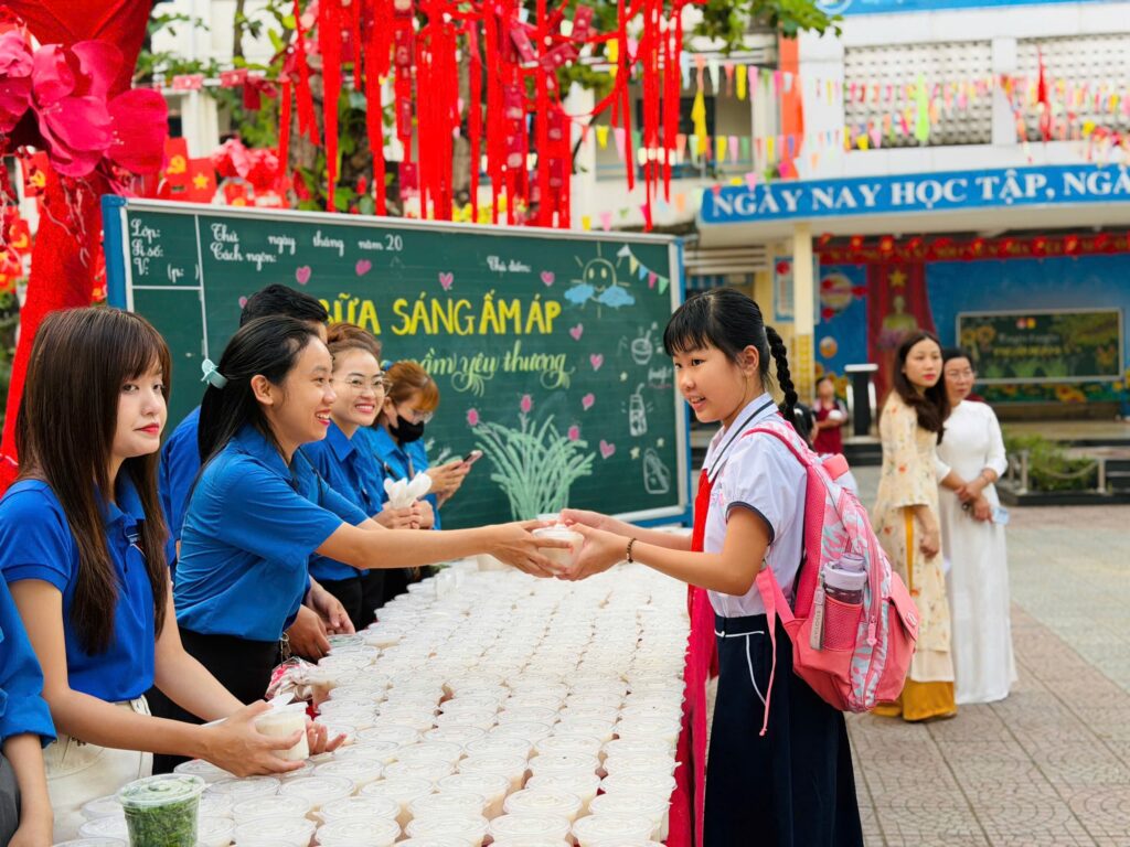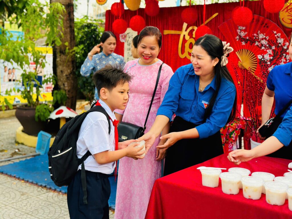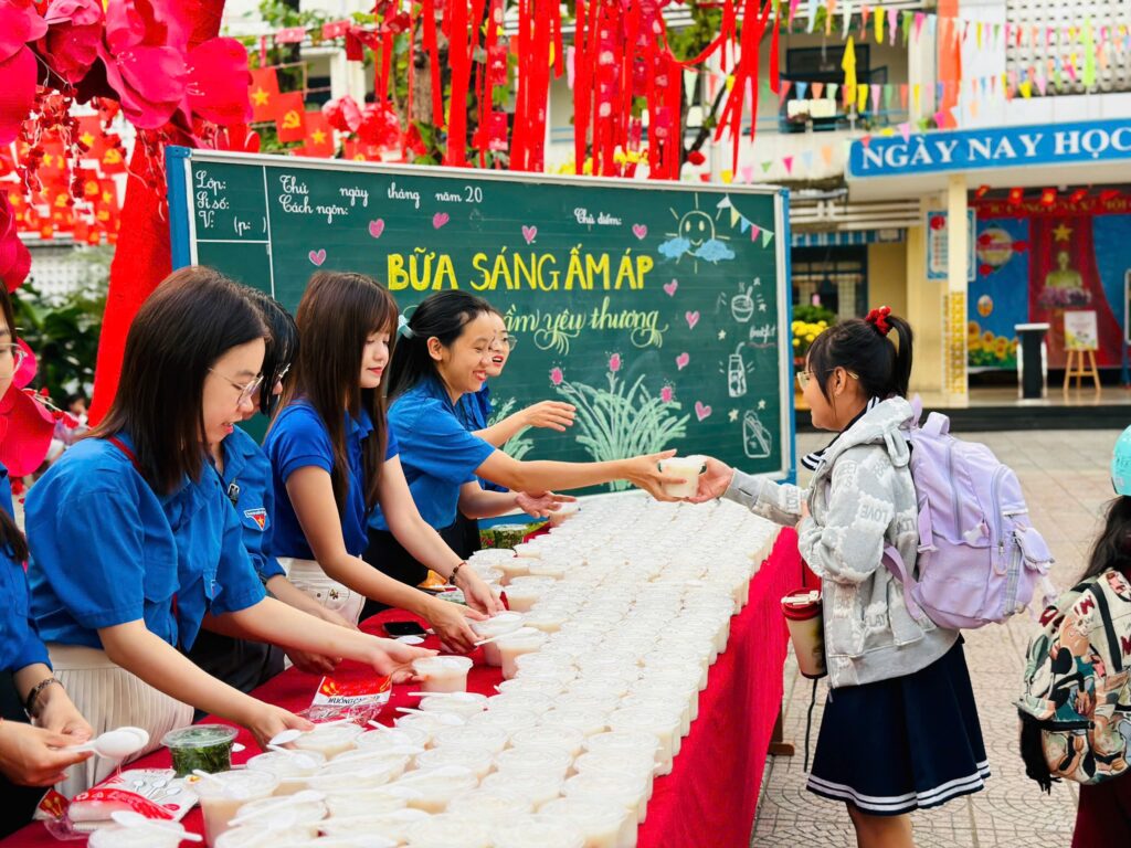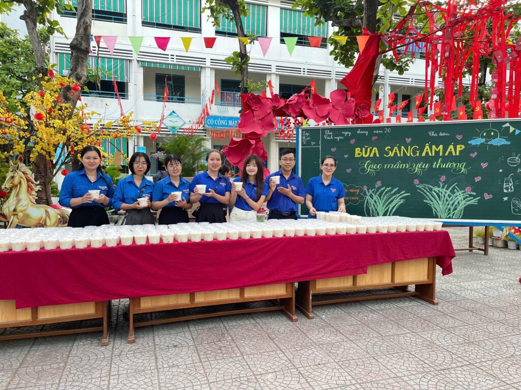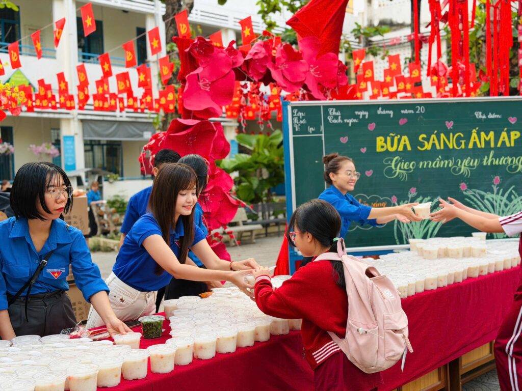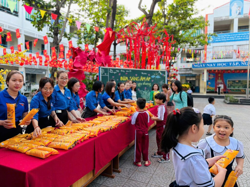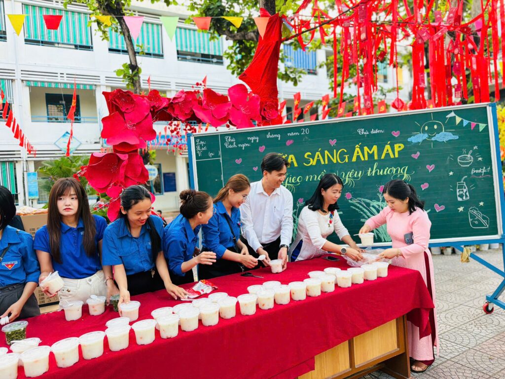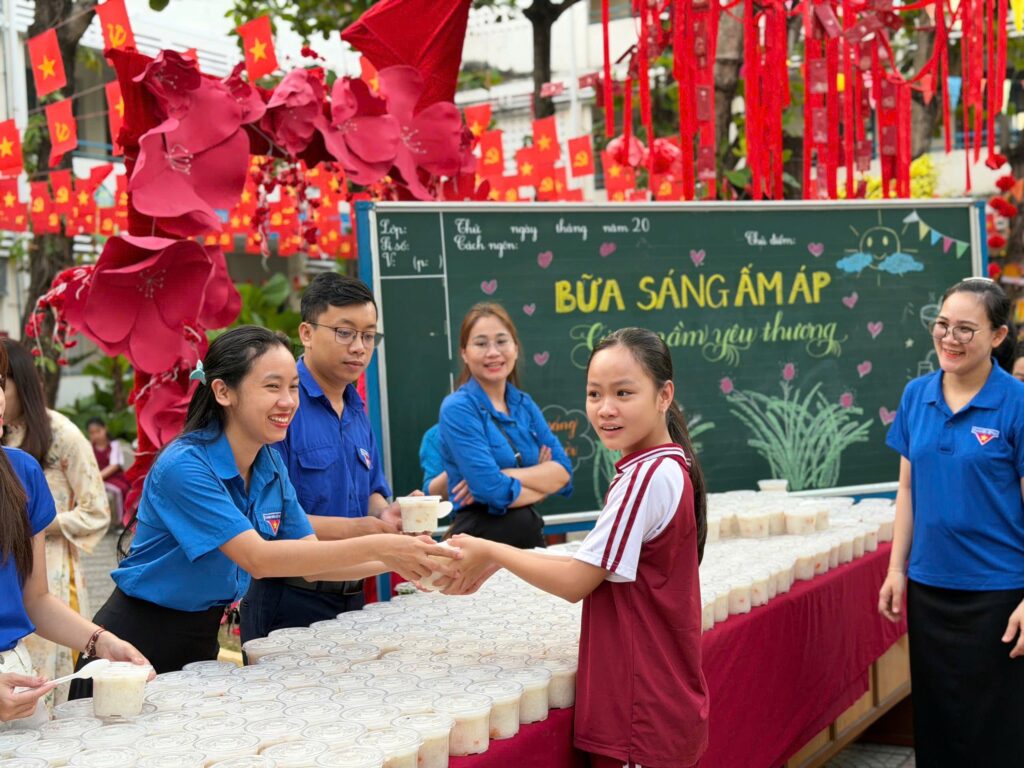 🌅 Sáng nay 2/3/2026 – nhằm ngày 14 tháng Giêng, sân trường Tiểu học Đinh Bộ Lĩnh rộn ràng hơn thường lệ. Từ rất sớm, các cô trong tà áo dài duyên dáng, các thầy cô trong Chi đoàn nhà trường đã tất bật chuẩn bị từng phần quà, từng tô cháo nóng hổi được xếp ngay ngắn trên những dãy bàn phủ khăn đỏ thắm.