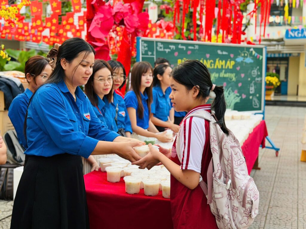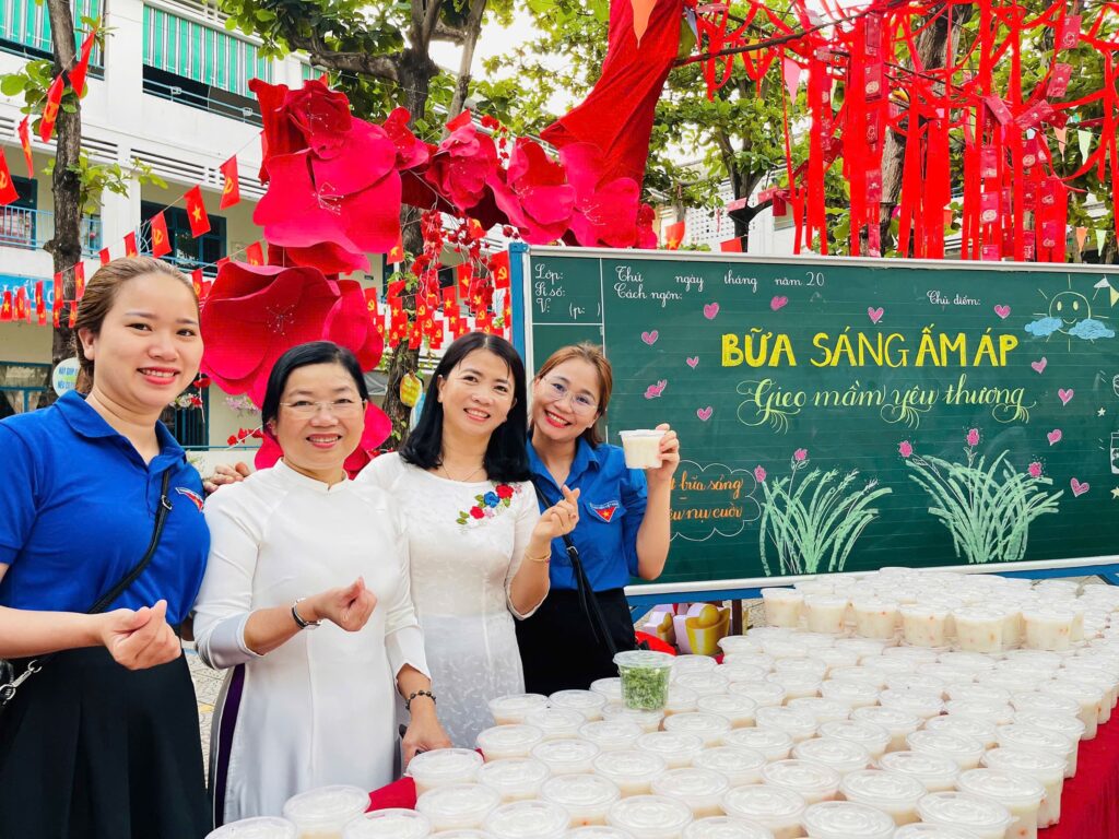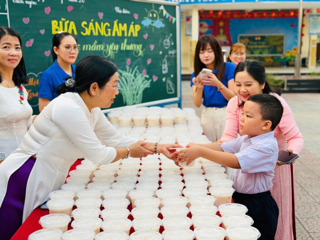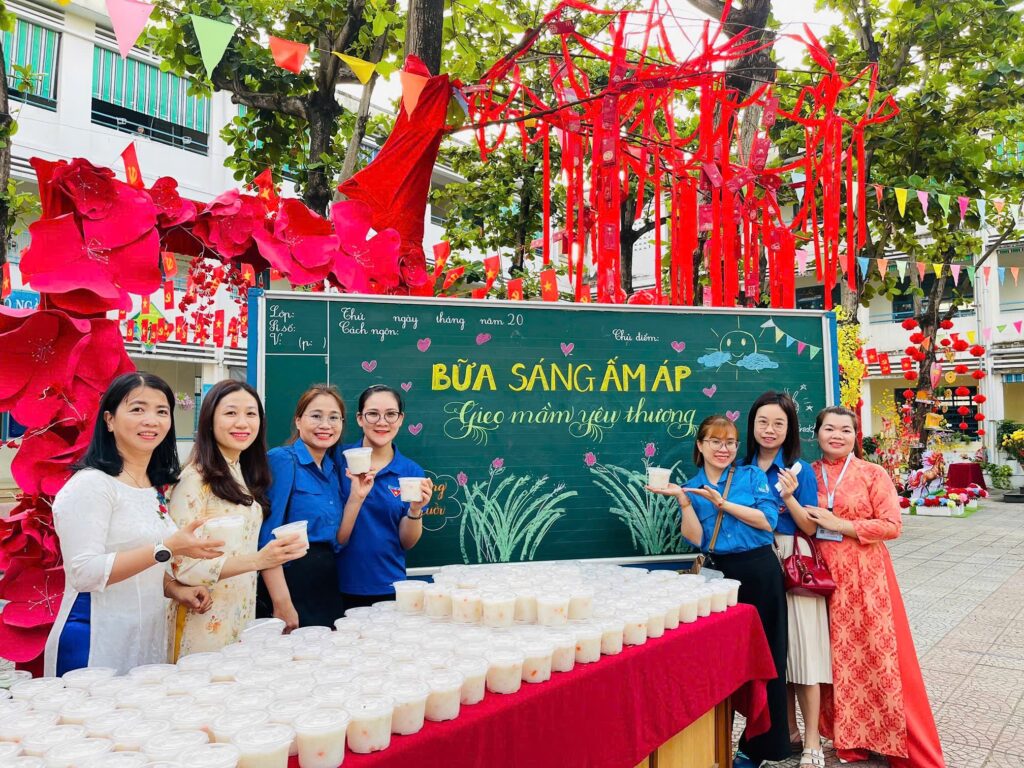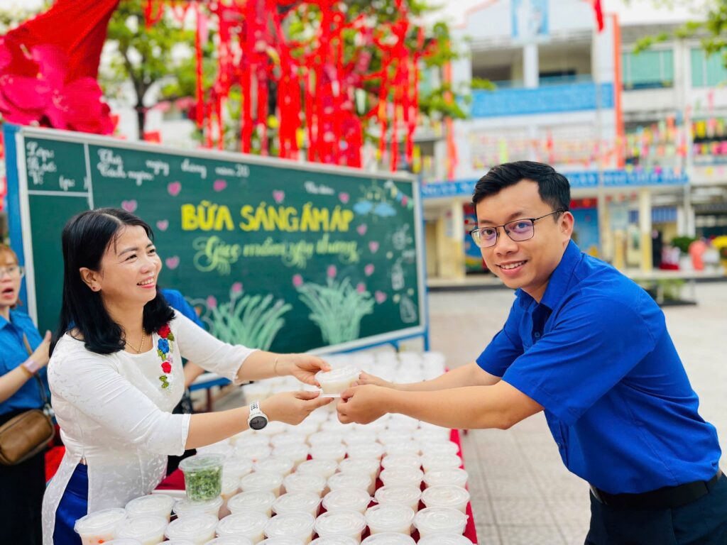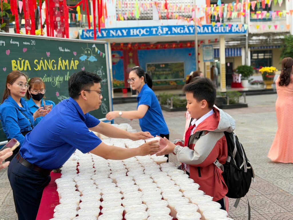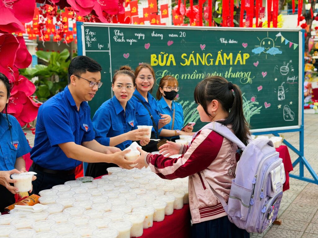 🌅 Sáng nay 2/3/2026 – nhằm ngày 14 tháng Giêng, sân trường Tiểu học Đinh Bộ Lĩnh rộn ràng hơn thường lệ. Từ rất sớm, các cô trong tà áo dài duyên dáng, các thầy cô trong Chi đoàn nhà trường đã tất bật chuẩn bị từng phần quà, từng tô cháo nóng hổi được xếp ngay ngắn trên những dãy bàn phủ khăn đỏ thắm.