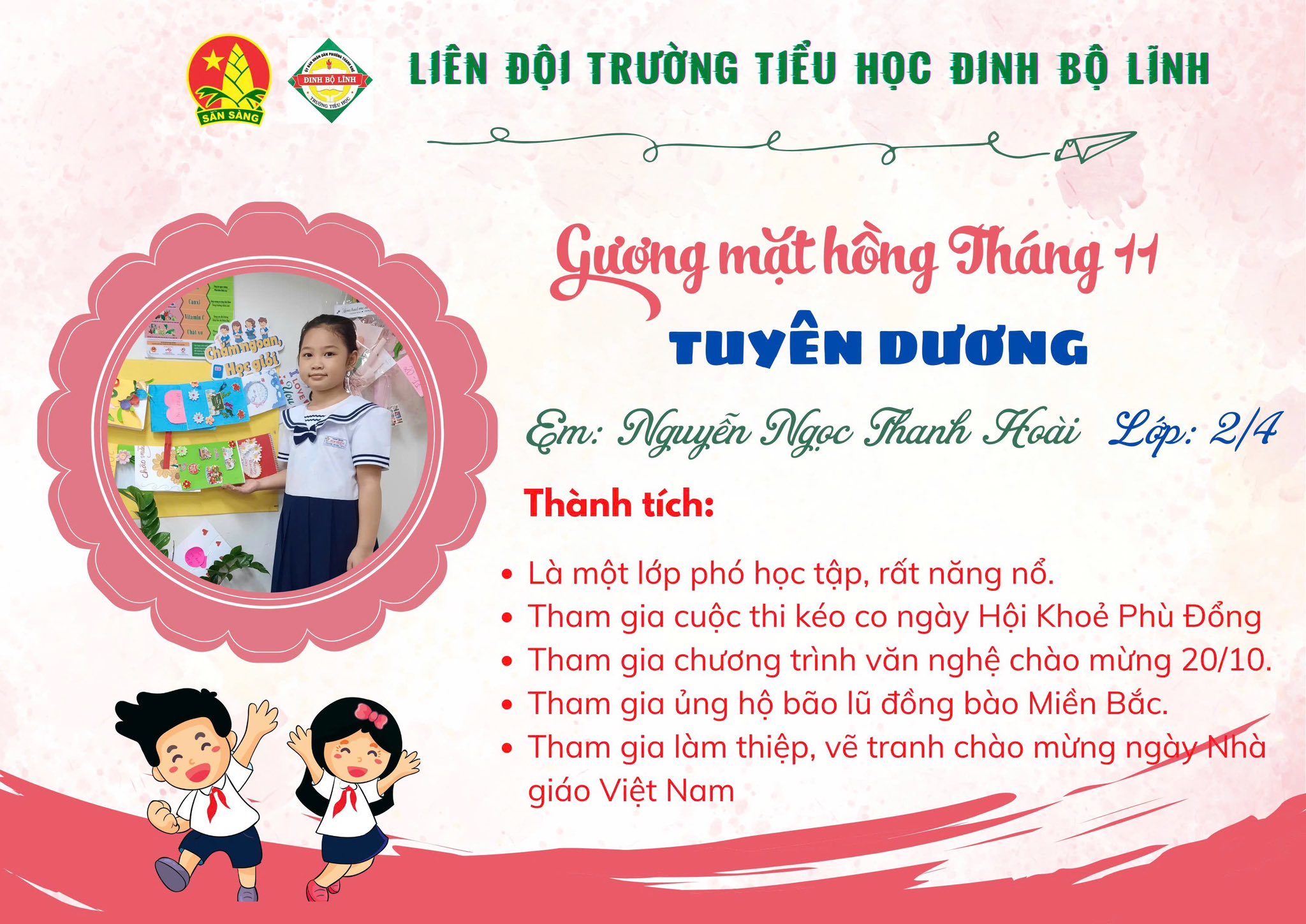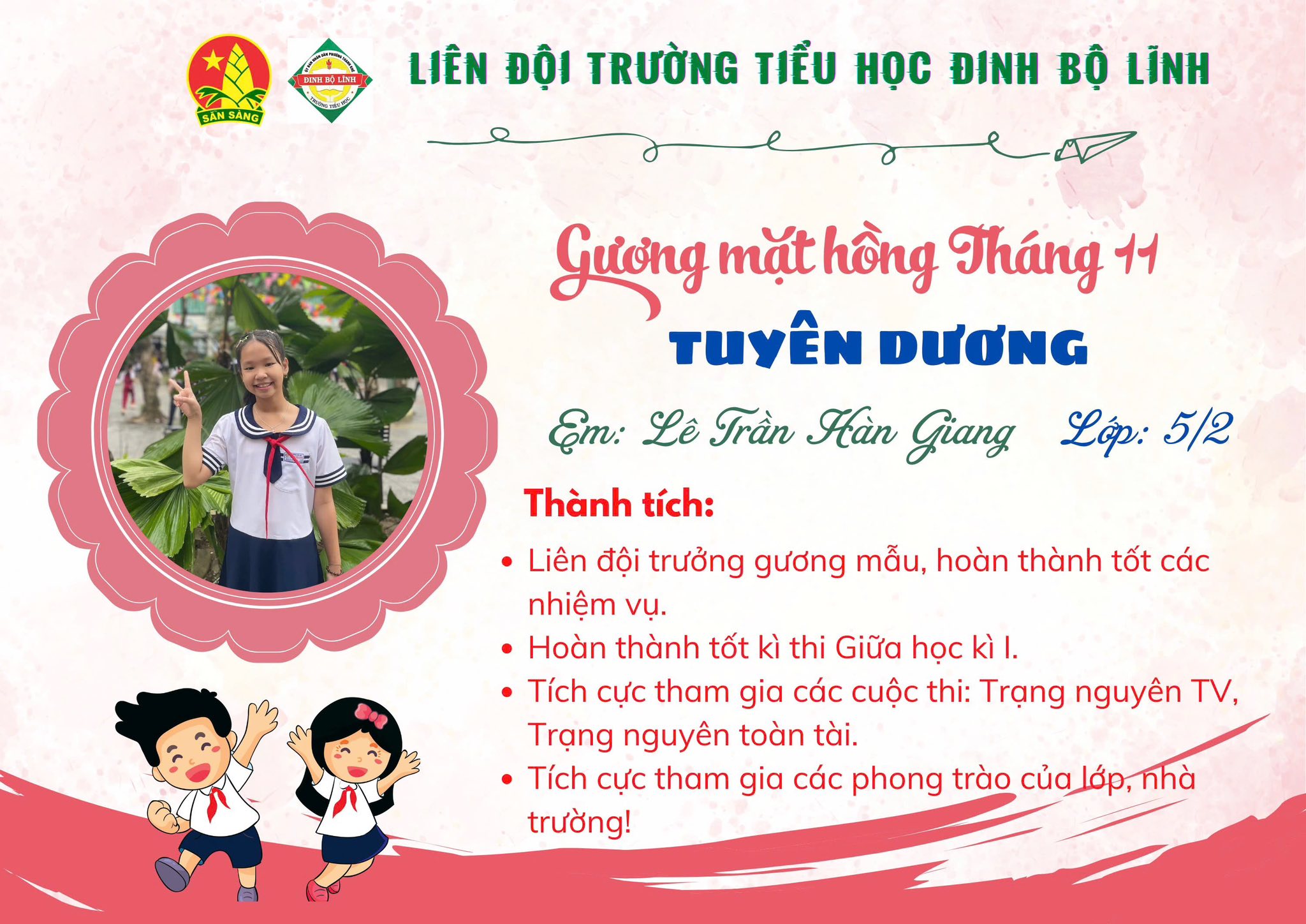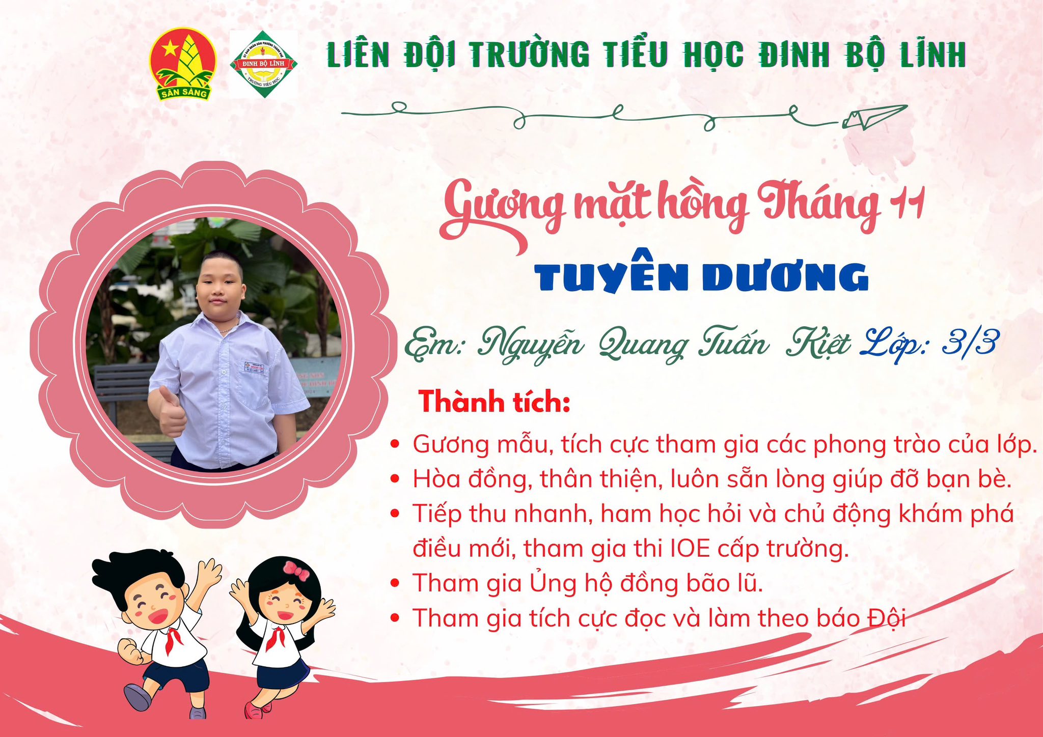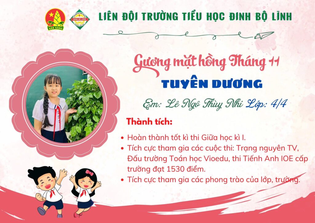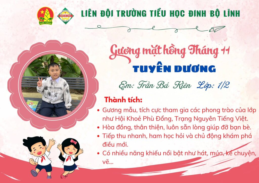 Tháng 11 – tháng của tri ân và yêu thương – không chỉ gợi nhắc về công ơn thầy cô mà còn là dịp để ghi nhận những nỗ lực đáng khen của các em học sinh. Trong không khí rộn ràng ấy, trường tiểu học Đinh Bộ Lĩnh vui mừng giới thiệu Gương mặt hồng tháng 11, các em đã tỏa sáng bằng tinh thần học tập nghiêm túc, lễ phép và đầy trách nhiệm.