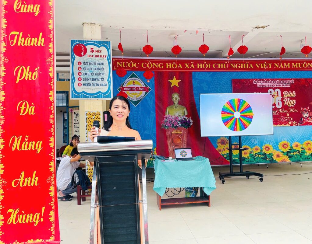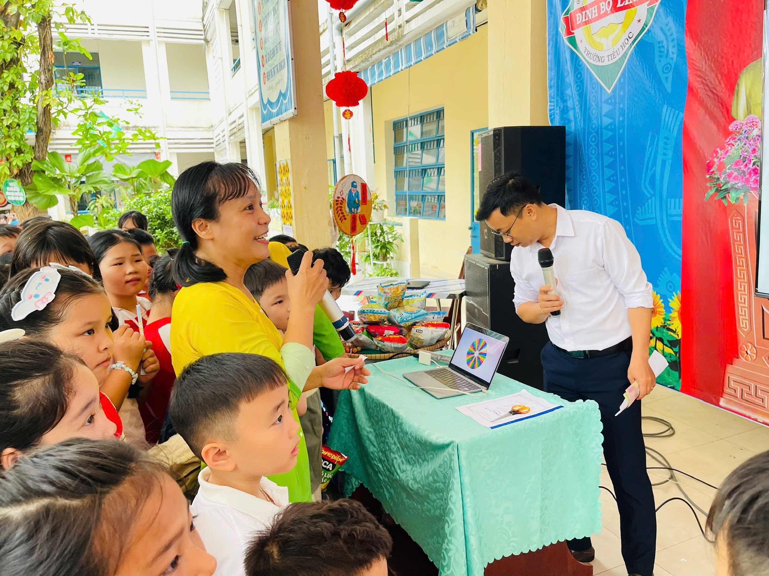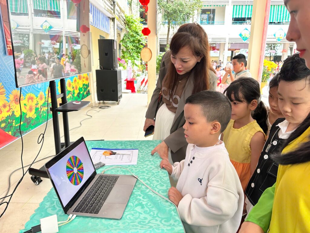 Đặc biệt, gian hàng trò chơi trở thành điểm đến sôi động với các hoạt động như: Bé vui ném lon, Tung vòng trúng đích và Vòng quay may mắn – trò chơi công nghệ số. Khu vực trò chơi công nghệ số luôn trong tình trạng kín chỗ, các bạn nhỏ xếp hàng ngay ngắn nhưng không giấu được sự háo hức, mong đến lượt mình trải nghiệm. Mỗi lượt tham gia là một lần hồi hộp, thích thú; mỗi phần quà nhỏ xinh là niềm vui lớn đầu năm mới. Tiếng cười và những tràng cổ vũ vang khắp sân trường đã góp phần làm nên một ngày hội thật trọn vẹn và đáng nhớ.