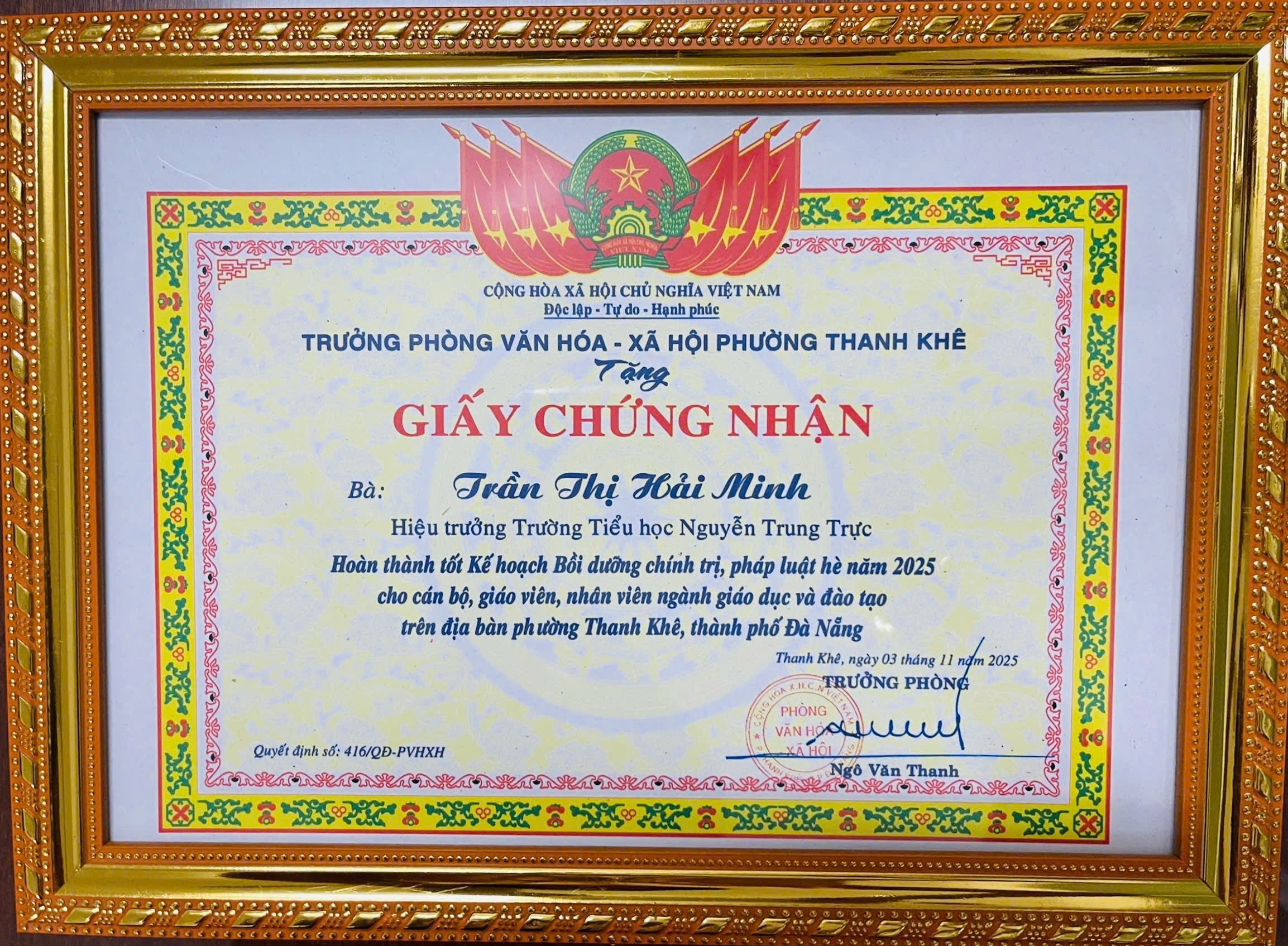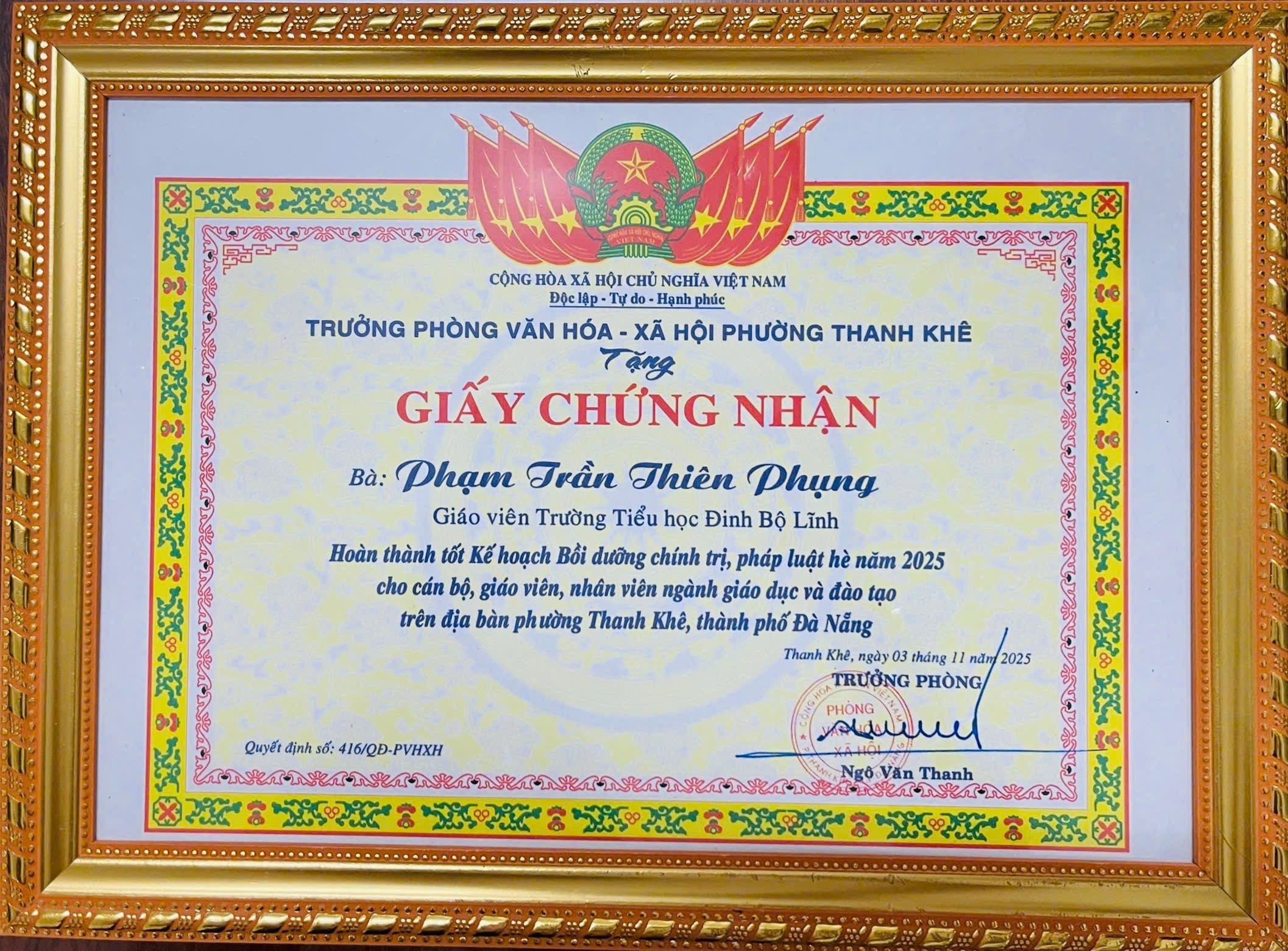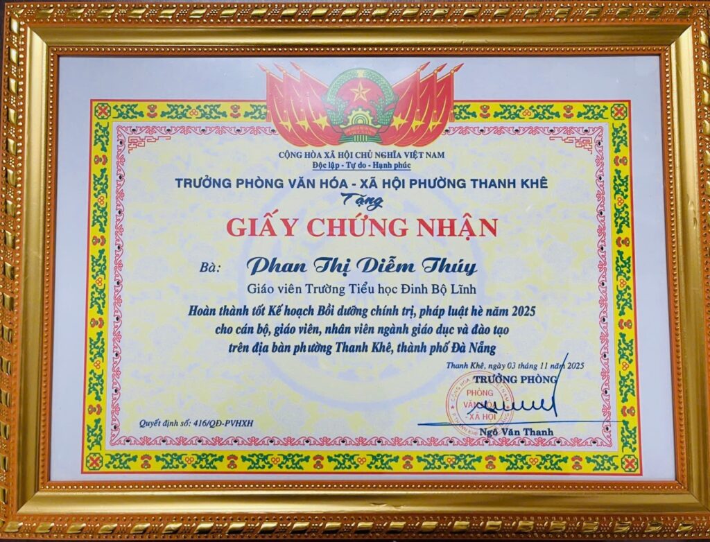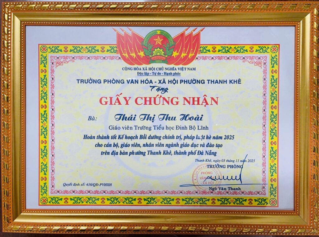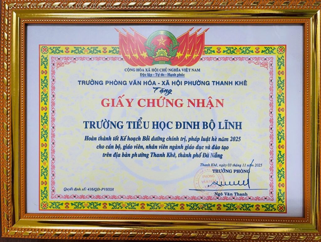 Trường Tiểu học Đinh Bộ Lĩnh trân trọng tuyên dương tập thể và 04 CBGV đã được Trưởng phòng Văn hóa – Xã hội phường Thanh Khê khen thưởng vì hoàn thành tốt Kế hoạch bồi dưỡng chính trị, pháp luật hè năm 2025, theo Quyết định số 416-QĐ/PVHXH.