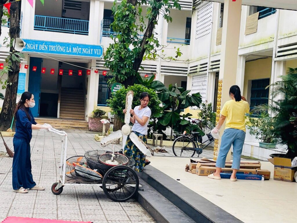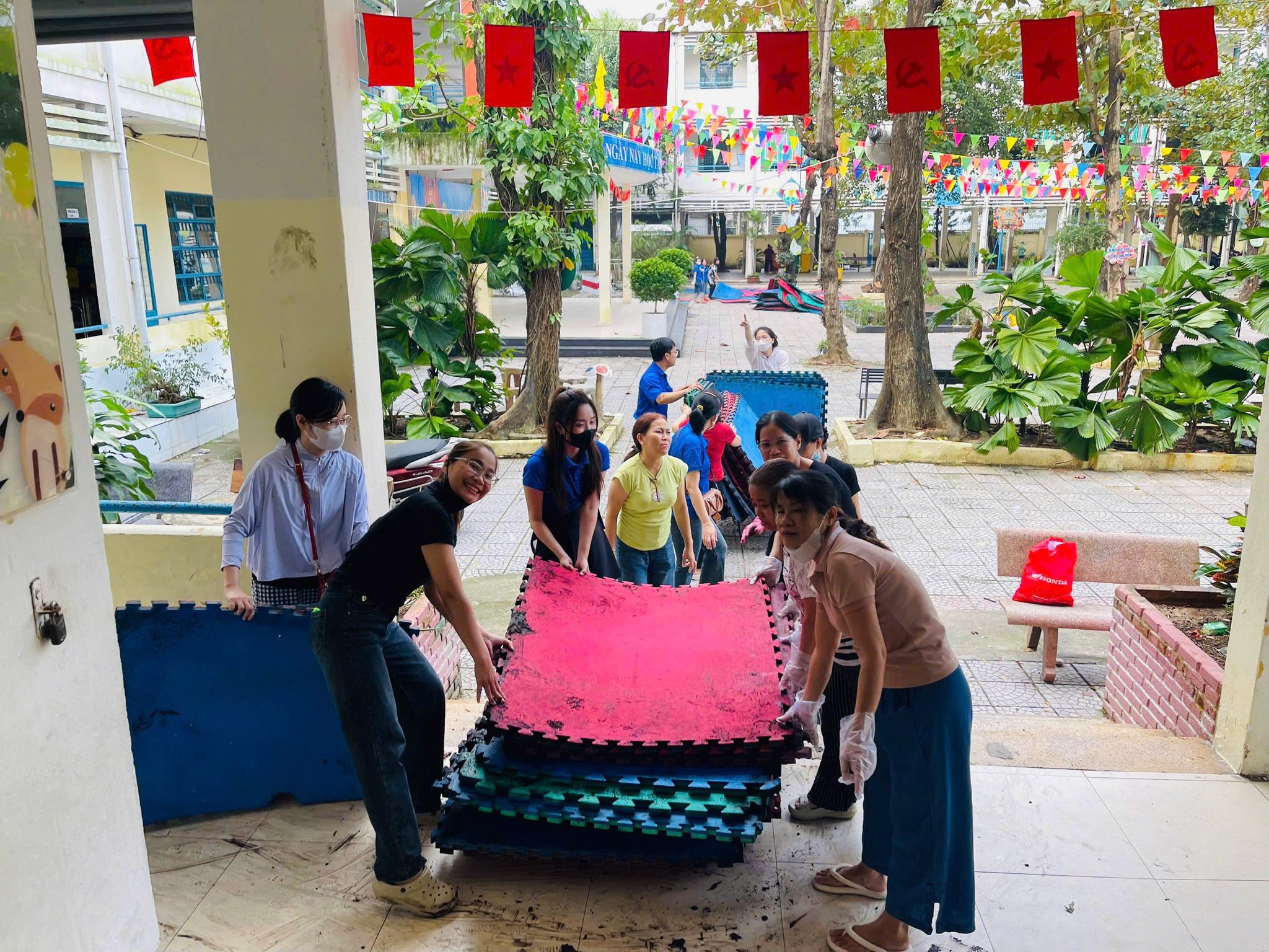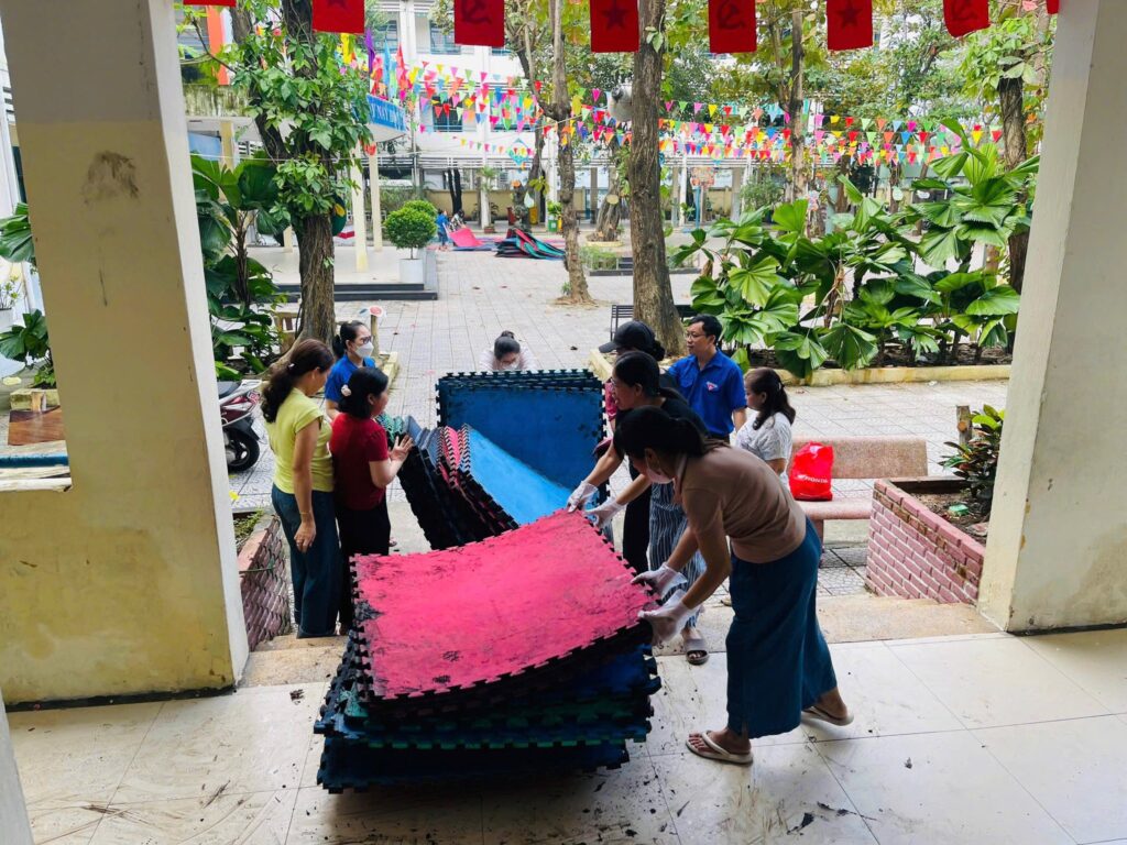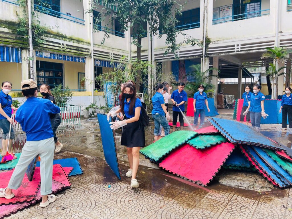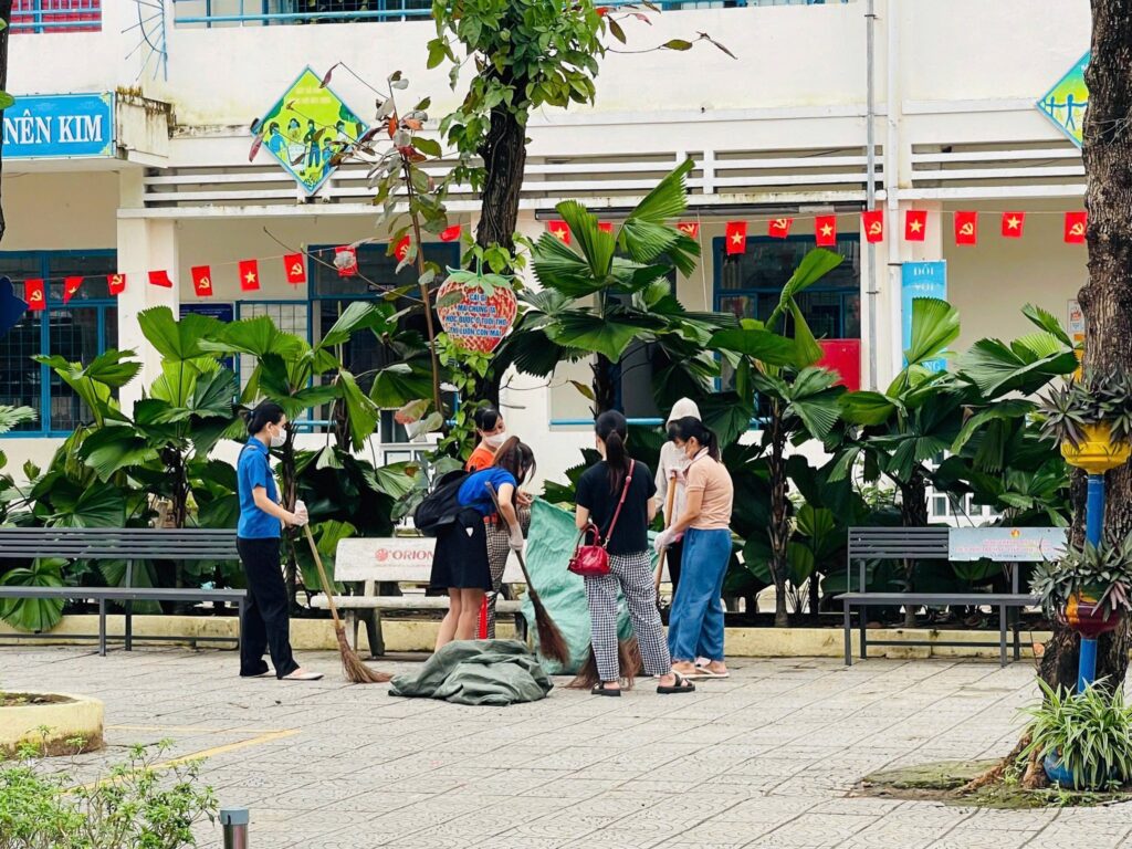 Các thầy cô và chi đoàn trường quét dọn từng hành lang, lớp học, sân trường, cổng trường; sắp xếp lại khuôn viên sân trường hợp lý; vệ sinh sạch sẽ các tấm xốp cho học sinh ngồi đọc sách.